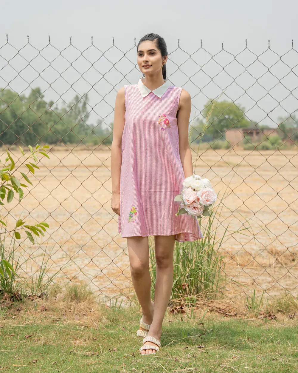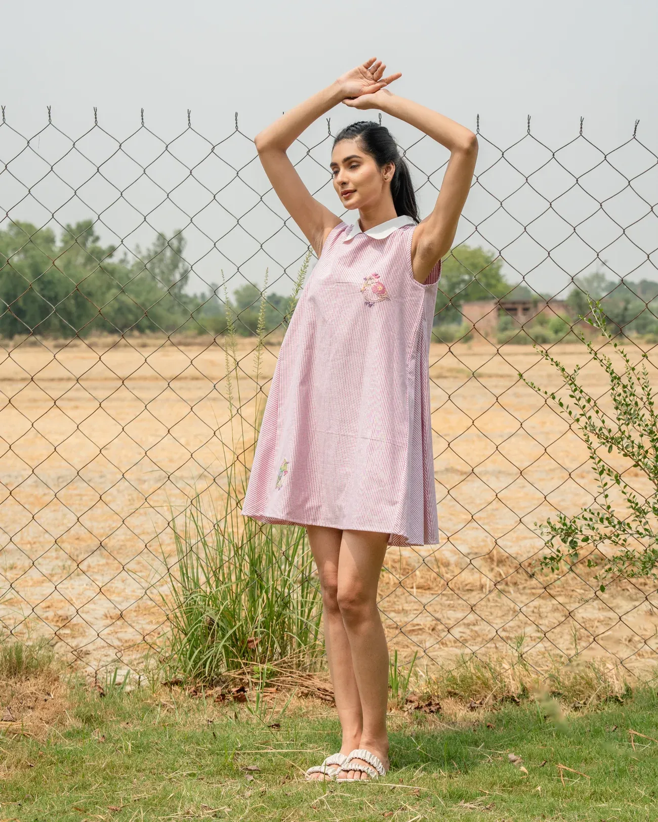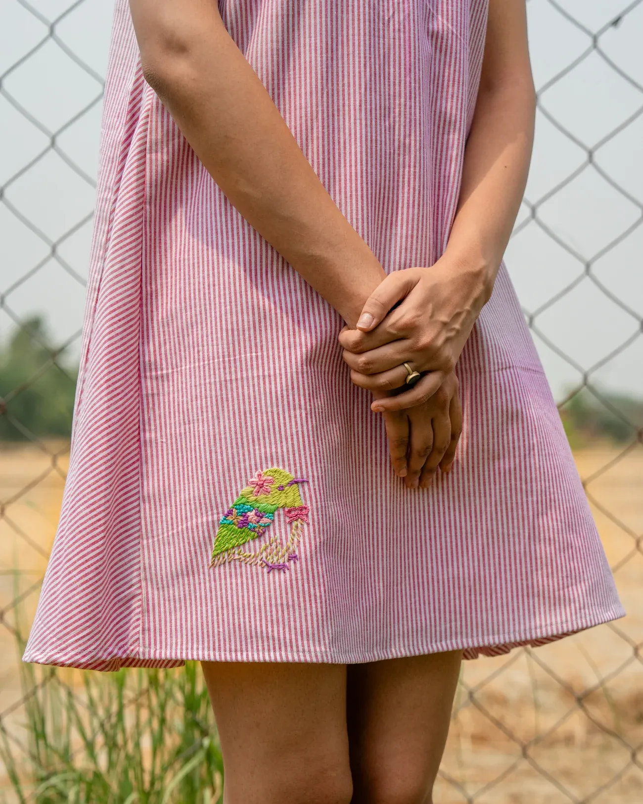 Whether you’re styling it with sandals and a straw bag or sneakers and a denim jacket, this hand-embroidered pink cotton mini dress fits every kind of slow fashion moment.