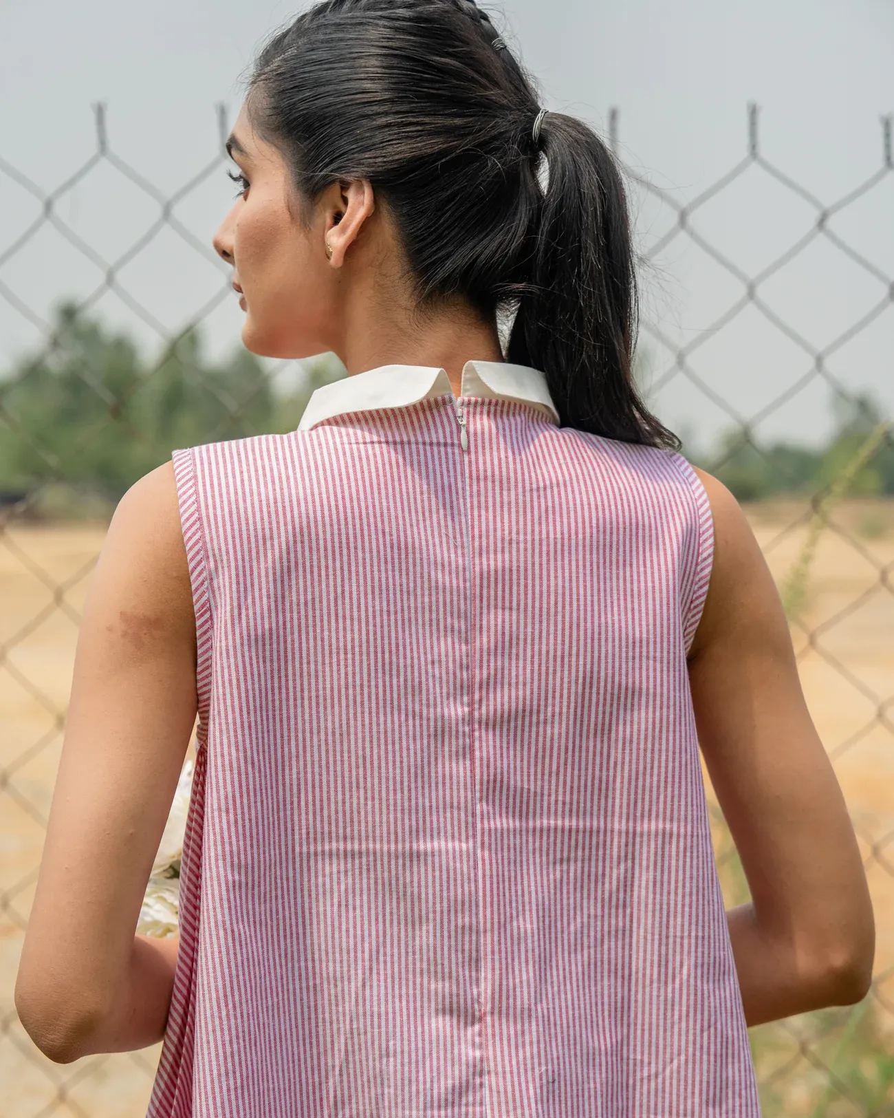 Crafted from lightweight breathable cotton, this sleeveless dress features subtle vertical stripes and charming embroidery placed near the chest and hemline. With its soft pastel color and clean structure, it’s perfect for garden brunches, vacations, or weekend lounging with elegance.