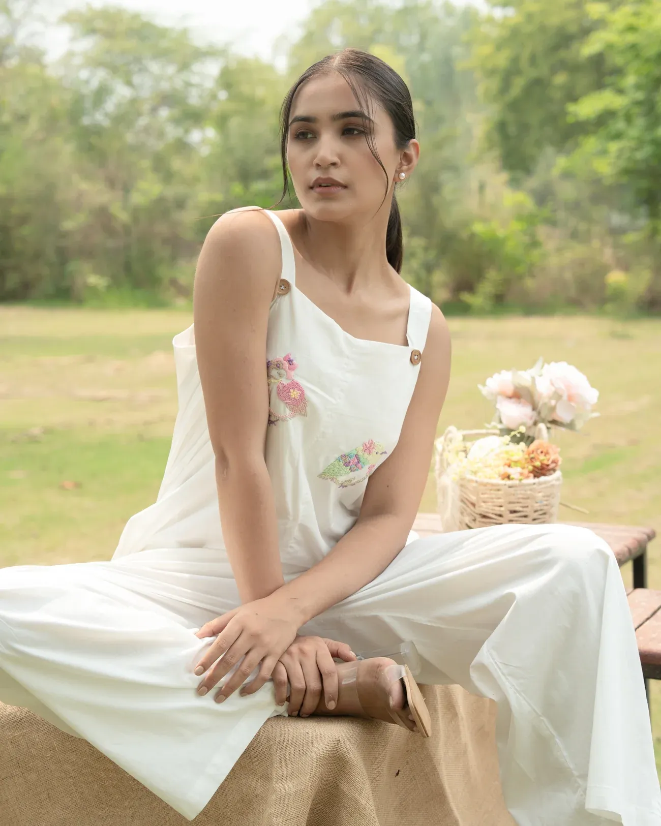 Embrace elegance and individuality with our hand-embroidered bird jumpsuit, a piece that transcends fashion to become wearable art. Crafted with care by master artisans in India, each stitch of this white cotton jumpsuit tells a story of patience, tradition, and beauty.