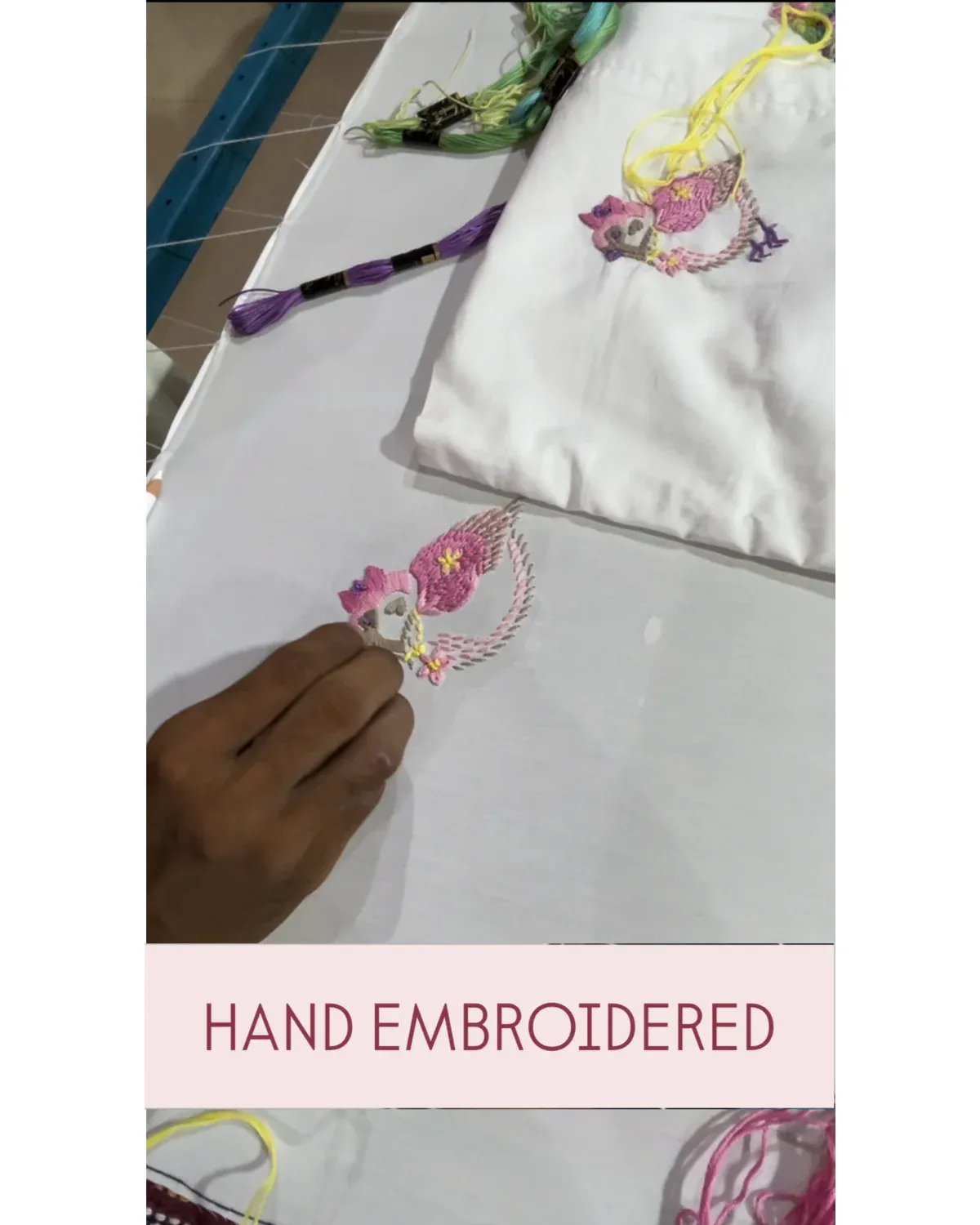The standout feature? Two vibrantly detailed embroidered birds perched on the chest — each one stitched by hand using time-honored techniques. The birds are more than decorative; they symbolize freedom, femininity, and grace. This unique piece is ideal for women who love subtle luxury and unapologetic creativity.
