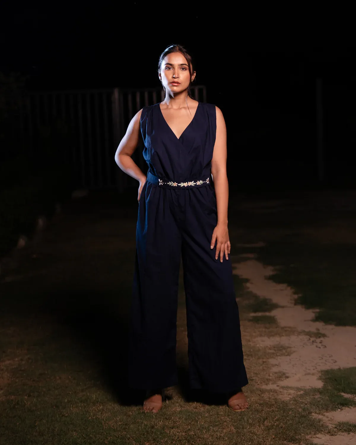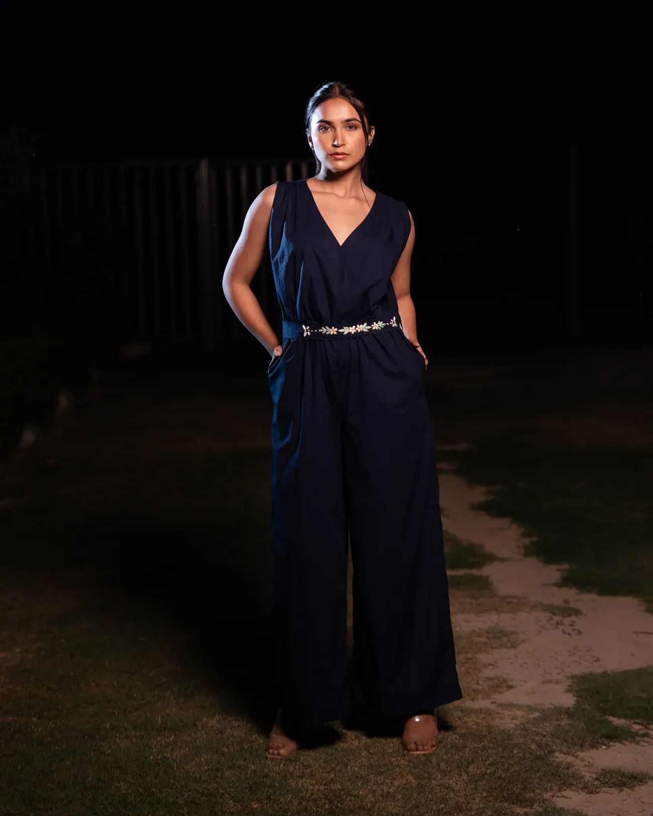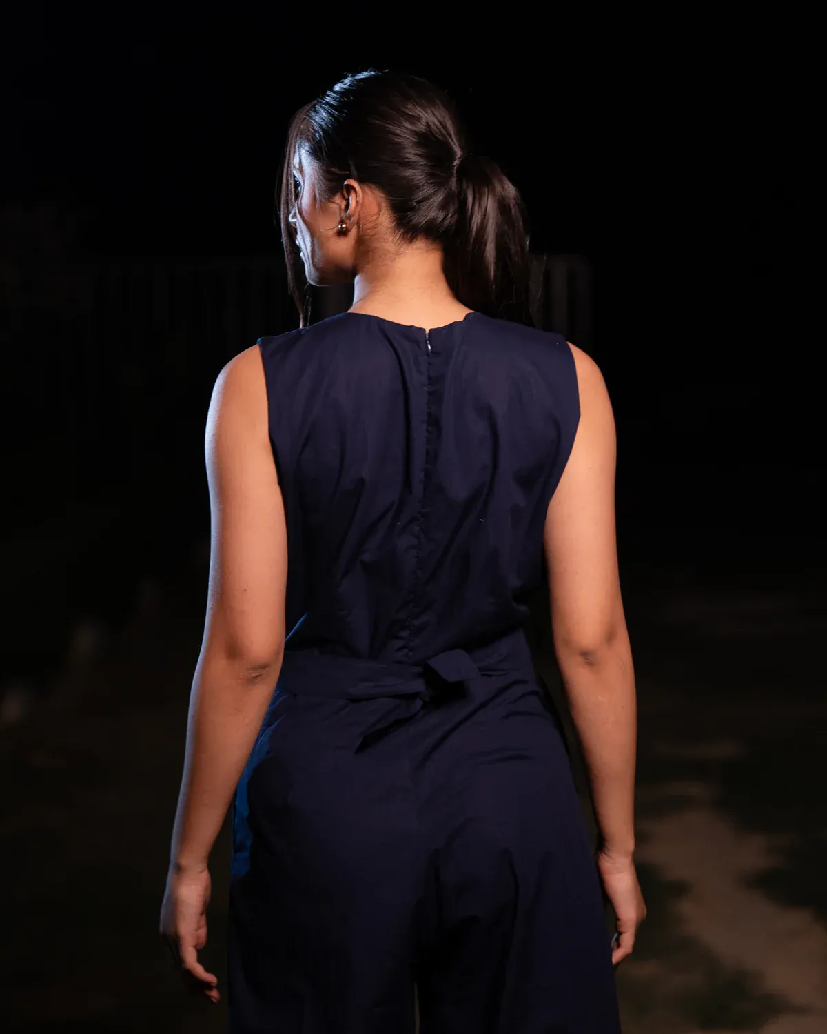 This sleeveless hand-embroidered navy cotton dress with belt is a celebration of subtle femininity, artisan detail, and wardrobe versatility.